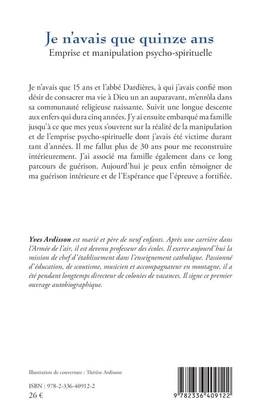Je n'avais que 15 ans et l'abbé Dardières, à qui j'avais confié mon désir de consacrer ma vie à Dieu un an auparavant, m'enrôla dans sa communauté religieuse naissante. Suivit une longue descente aux enfers qui dura cinq années. J'y ai ensuite embarqué ma famille jusqu'à ce que mes yeux s'ouvrent sur la réalité de la manipulation et de l'emprise psycho-spirituelle dont j'avais été victime durant tant d'années. Il me fallut plus de 30 ans pour me reconstruire intérieurement. J'ai associé ma famille également dans ce long parcours de guérison. Aujourd'hui je peux enfin témoigner de ma guérison intérieure et de l'Espérance que l'épreuve a fortifiée.