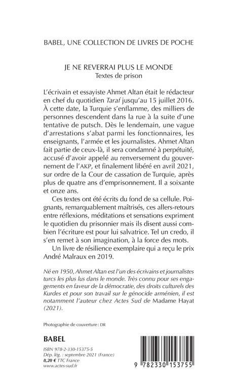 L'écrivain et essayiste Ahmet Altan était le rédacteur en chef du quotidien "Taraf" jusqu'au 15 juillet 2016. À cette date, la Turquie s'enflamme, des milliers de personnes descendent dans la rue suite à une tentative de putsch. Dès le lendemain, une vague d'arrestations s'abat parmi les fonctionnaires, les enseignants, l'armée et les journalistes. Ahmet Altan fait partie de ceux-là, il sera condamné à perpétuité, accusé d'avoir appelé au renversement du gouvernement de l'AKP, et finalement libéré en avril 2021, sur ordre de la Cour de cassation de Turquie, après plus de quatre ans d'emprisonement. Il a 71 ans. Ces textes ont été écrits du fond de sa cellule. Poignants, remarquablement maîtrisés, ces allers-retours entre réflexions, méditations et sensations expriment le quotidien du prisonnier mais ils disent aussi combien l'écriture est pour lui salvatrice. Tel un credo, il s'en remet à son imagination, à la force des mots. Un livre de résilience exemplaire qui a reçu le prix André Malraux en 2019.