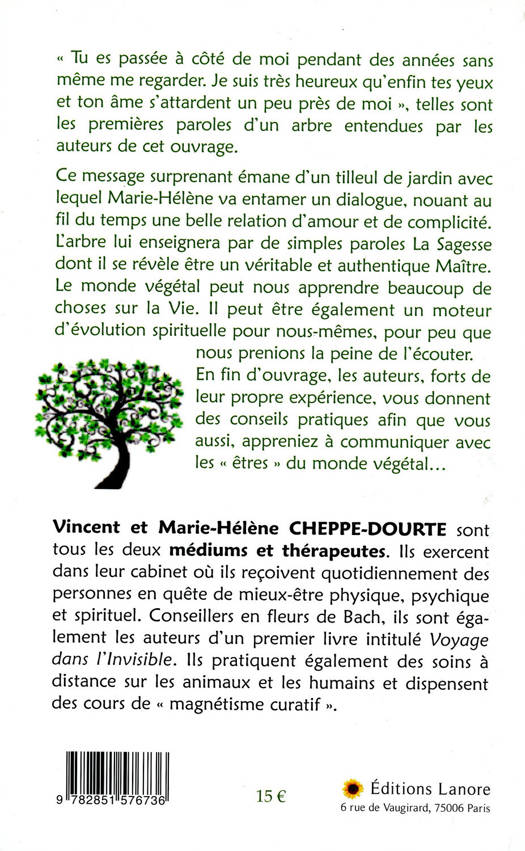 "Tu es passé à côté de moi pendant des années sans même me regarder. Je suis très heureux qu'enfin tes yeux et ton âme s'attardent un peu près de moi", telles sont les premières paroles d'un arbre entendues par les auteurs de cet ouvrage. Ce message surprenant émane d'un tilleul de jardin avec lequel Marie-Hélène va entamer un dialogue, nouant au fil du temps une belle relation d'amour et de complicité. L'arbre lui enseignera par de simples paroles La Sagesse dont il se révèle être un véritable et authentique Maître. Le monde végétal peut nous apprendre beaucoup de choses sur la vie. Il peut être également un moteur d'évolution spirituelle pour nous-mêmes, pour peu que nous prenions la peine de l'écouter. En fin d'ouvrage, les auteurs, forts de leur propre expérience, vous donnent des conseils pratiques afin que vous aussi, appreniez à communiquer avec les "êtres" du monde végétal...