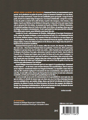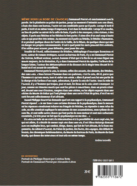 Sans jamais lâcher la robe de l’avocat, Emmanuel Pierrat nous parle des sept vies qu’il mène à chaque instant du jour et de la nuit. De la plaidoirie à ses échanges nocturnes avec des fétiches, on songe au Cicéron, l’auteur De la divination.<br /> MÊME SOUS LA ROBE DE L’AVOCAT, Emmanuel Pierrat vit constamment avec la parole. De la plaidoirie au palais de justice, jusqu’au moment d’intimité avec son client, à huis clos dans son bureau, l’autre est son semblable parce qu’il parle. Lorsqu’il écrit il parle, il écrit et en même temps il improvise, il est dans la théâtralité. Lorsqu’il se couche, au lieu de parler au miroir de la salle de bain, il parle à des masques, à des statues, à des objets. Il parle aux fétiches et les fétiches le font parler. Il aime dire d’un seul coup à haute voix ce qui peut être très intime. Au moment où il parle au fétiche, le fétiche s’humanise, il se produit quelque chose de l’ordre de la faille, de la fêlure, de quelque chose qui met en danger ses propres raisonnements. Il sait à quel point les mots peuvent être violents, il les utilise pour accuser, pour défendre, pour jouer des vies.<br /> Troublé de l’éveil, collectionneur de fétiches, bibliophage d’ouvrages licencieux et rares, auteur de romans érotiques, avocat au barreau de Paris, il y a en Emmanuel Pierrat du Cicéron, brillant orateur, avocat, homme d’état qui à la fin de sa vie nous lègue son oeuvre majeure, De la divination, il y a dans Emmanuel Pierrat du Apulée, l’orfèvre de la langue latine, l’auteur des Métamorphoses et du discours De la Magie tenu devant le tribunal où il est accusé de sorcellerie.<br /> Emmanuel Pierrat porte la voix, la sienne, celles des accusés, des absents, des fétiches, des sans voix. « Vous laissez l’homme dans ses pulsions, c’est la cata, dit-il, parce que l’homme n’a qu’une envie, tuer et violer son voisin. » Alors il prend avec lui une partie de la charge et du fardeau d’un sujet, advocatum, il porte la voix de l’autre. Sous la robe de l’avocat, il y a l’homme qui traque, jour et nuit, les lieux où la voix vient à manquer. Le jour, comme ces témoins muets que sont les pièces à convictions, dans un procès criminel, devant une cour d’Assises, rangées dans une vitrine, ou les objets exposés dans une vitrine du Musée de Dakar qui l’ont plongé dans une sorte d’état de grâce, d’où il en est sorti fervent collectionneur d’art africain.<br /> Quand Philippe Bouret lui demande quel est son rapport à la psychanalyse, Emmanuel Pierrat répond : « Je me tiens à une certaine distance de la psychanalyse, dans la mesure où les réponses viendraient éclairer ma fringale de fétiches, ou répondre à mon refus du vide, où elle viendrait expliquer le mécanisme de mes accumulations, mon rythme de vie sans fin, et cent mille autres choses qui font partie de mon moteur et sont mes carburants essentiels, j’ai très peur en fait que la psychanalyse ne me dise... »<br /> Il a vécu en Inde où on croit à la réincarnation et à la possibilité de vivre sept vies, lui qui est athée, il a décidé de mener sept vies dans une vie, il est Shiva Nataraja dansant avec ses multiples bras, qui combat, dirige, danse, qui fait de l’art africain, de la franc-maçonnerie, du cabinet d’avocat, du Palais de justice, des livres, des voyages, des débats télévisés, des chroniques hebdomadaires, du Musée du barreau de Paris, du Musée du Quai Branly, qui donne des interviews et tout cela en même temps.