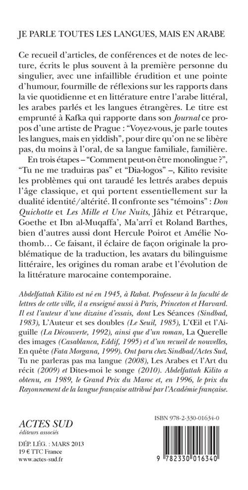 En trois étapes - "Comment peut-on être monolingue ?", "Tu ne me traduiras pas" et "Dia-logos" -, Kilito revisite les problèmes qui ont taraudé les lettrés arabes depuis l'âge classique, et qui portent essentiellement sur la dualité identité/altérité. Il confronte ses "témoins" : «Don Quichotte» et «Les Mille et Une Nuits», Jâhiz et Pétrarque, Goethe et Ibn al-Muqaffa', Ma'arrî et Roland Barthes, bien d'autres aussi dont Hercule Poirot et Amélie Nothomb... Ce faisant, il éclaire de façon originale la problématique de la traduction, les avatars du bilinguisme littéraire, les origines du roman arabe et l'évolution de la littérature marocaine contemporaine.