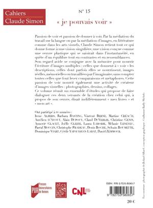 Ce quinzième volume des Cahiers Claude Simon, intitulé « je pouvais voir », se donne pour objet les pratiques de l'écrivain créateur et descripteur d'images mentales ou iconiques. En littérature comme dans les arts visuels, Claude Simon cherche à donner forme à une vision singulière qui reconfigure la réalité : « seul l'artiste (le peintre ou l'écrivain) donne forme à ce qui échappe à la perception commune. » Une vision fondée sur des principes de structuration comparables à ceux de la peinture, la construction d'un équilibre fait de contrastes et de ressemblances, en quête d'une impossible simultanéité.