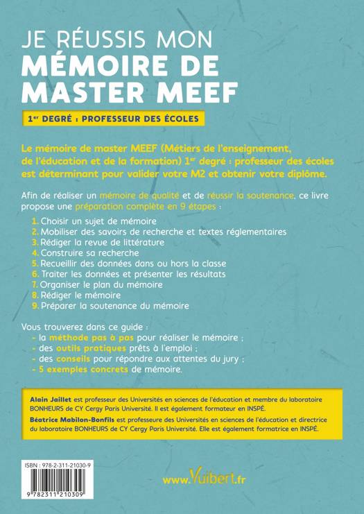 Le mémoire de Master MEEF 1er degré (mémoire universitaire à orientation professionnelle) est déterminant pour valider votre M2 et obtenir votre diplôme (10 crédits ECTS).