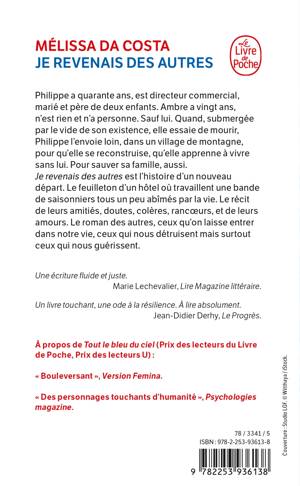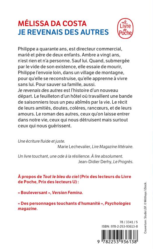 Philippe a quarante ans, est directeur commercial, marié et père de deux enfants. Ambre a vingt ans, n’est rien et n’a personne. Sauf lui. Quand, submergée par le vide de sa vie, elle essaie de mourir, Philippe l’envoie loin, dans un village de montagne, pour qu’elle se reconstruise, qu’elle apprenne à vivre sans lui. Pour sauver sa famille aussi. Je revenais des autres est l’histoire d’un nouveau départ. Le feuilleton d’un hôtel où vit une bande de saisonniers tous un peu abîmés par la vie. Le récit de leurs amitiés, doutes, colères, rancœurs, amours aussi. Le roman des autres, ceux qu’on laisse entrer dans sa vie, ceux qui nous détruisent mais surtout ceux qui nous guérissent.