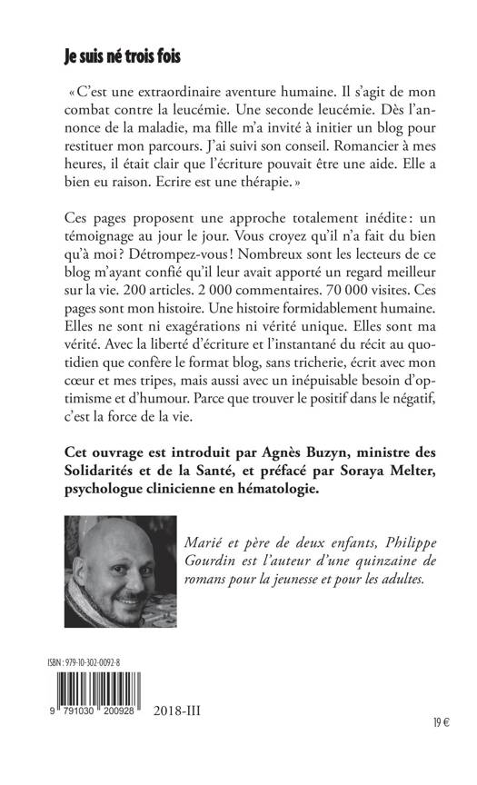 C'est une extraordinaire aventure humaine. Il s'agit de mon combat contre la leucémie. Une seconde leucémie. Dès l'annonce de la maladie, ma fille m'a invité à initier un blog pour restituer mon parcours. J'ai suivi son conseil. Romancier à mes heures, il était clair que l'écriture pouvait être une aide. Elle a bien eu raison. Écrire est une thérapie. Ces pages proposent une approche totalement inédite : un témoignage journalier. Vous croyez qu'il n'a fait du bien qu'à moi ? Détrompez-vous ! Nombreux sont les lecteurs de ce blog m'ayant confié qu'il leur avait apporté un regard meilleur sur la vie. 200 articles. 2 000 commentaires. 70 000 visites. Ces pages sont mon histoire. Une histoire formidablement humaine. Elles ne sont ni exagérations ni vérité unique. Elles sont ma vérité au jour le jour. Avec la liberté d'écriture et l'instantané du récit au quotidien que confère le format blog, sans tricherie, écrit avec mon cur et mes tripes, mais aussi avec un inépuisable besoin d'optimisme et d'humour. Parce que trouver le positif dans le négatif, c'est la force de la vie. Ce livre est introduit par Agnès Buzyn, ministre des Solidarités et de la Santé et préfacé par Soraya Melter, psychologue-clinicienne en hématologie.