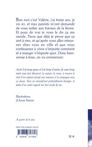 Je suis trop vert est la suite de J’ai trop d’amis, qui faisait suite à J’ai trop peur. Après l’été passé à appréhender dans l’angoisse son entrée en sixième (J’ai trop peur), après les premiers jours de cette nouvelle vie scolaire et sociale (J’ai trop d’amis), Moi poursuit son apprentissage de la sixième, cette époque charnière de la vie : cette fois on l’envoie en classe verte.