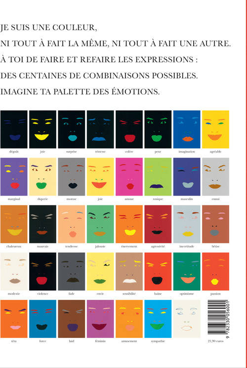 Un album pêle-mêle pour s'initier au langage des couleurs et aux émotions qui leur sont associées. Les expressions du langage - « rouge de colère », « vert de peur », « rire jaune », « fleur bleue »... - accompagnent les expressions du visage - une galerie colorée de portraits en cadrage serré, masques expressifs. Les pages du livre, découpées en deux, invitent à jouer avec cette palette d'expressions, d'émotions et de couleurs, en multipliant les combinaisons à l'infini. Une expérimentation intime et ludique de la couleur dans un beau livre d'artiste.