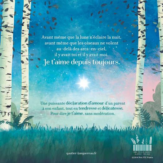 Avant même que la lune n'éclaire la nuit, avant même que les oiseaux ne volent au-delà des arc-en-ciel, il y avait toi et il y avait moi. Je t'aime depuis toujours. Une puissante déclaration d'amour d'un parent à son enfant, tout en tendresse et délicatesse. Pour dire je t'aime, sans modération.