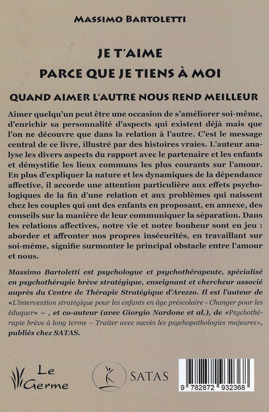 Aimer quelqu'un peut être une occasion de s'améliorer soi-même, d'enrichir sa personnalité d'aspects qui existent déjà mais que l'on ne découvre que dans la relation à l'autre. C'est le message central de ce livre, illustré par des histoires vraies. L'auteur analyse les divers aspects du rapport avec le partenaire et les enfants et démystifie les lieux communs les plus courants sur l'amour. En plus d'expliquer la nature et les dynamiques de la dépendance affective, il accorde une attention particulière aux effets psychologiques de la fin d'une relation et aux problèmes qui naissent chez les couples qui ont des enfants en proposant, en annexe, des conseils sur la manière de leur communiquer la séparation. Dans les relations affectives, notre vie et notre bonheur sont en jeu : aborder et affronter nos propres insécurités, en travaillant sur soi-même, signifie surmonter le principal obstacle entre l'amour et nous.