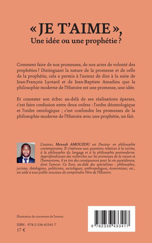 Comment faire de nos promesses, de nos actes de volonté des prophéties ? Distinguant la nature de la promesse et de celle de la prophétie, cela a permis à l'auteur de dire à la suite de Jean-François Lyotard et de Jean-Baptiste Amadieu que la philosophie moderne de l'Histoire est une promesse, une idée. Et constater son échec au-delà de ses réalisations éparses, c'est faire confusion entre deux ordres l'ordre déontologique et l'ordre ontologique; c'est confondre les promesses de la philosophie moderne de l'Histoire avec une prophétie, un fait.
