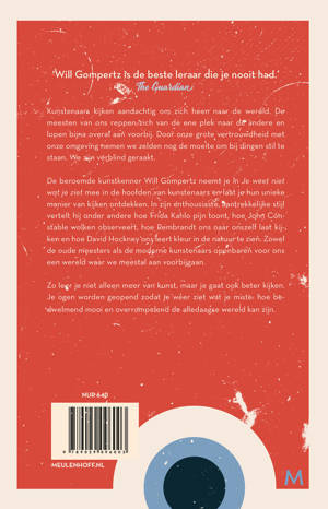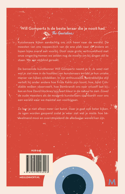 Gompertz leert ons via kunst met een nieuwe, frisse blik naar de wereld om ons heen te kijken – zowel voor degene die zich voor het eerst in kunst gaat verdiepen als voor de doorgewinterde museumbezoeker Kunstenaars kijken aandachtig om zich heen naar de wereld. De meesten van ons reppen zich van de ene plek naar de andere en lopen bijna overal aan voorbij. Door onze grote vertrouwdheid met onze omgeving nemen we zelden nog de moeite om bij dingen stil te staan. We zijn verblind geraakt. De beroemde kunstkenner Will Gompertz neemt je in Je weet niet wat je ziet mee in de hoofden van kunstenaars en laat je hun unieke manier van kijken ontdekken. In zijn enthousiaste, aantrekkelijke stijl vertelt hij onder andere hoe Frida Kahlo pijn toont, hoe John Constable wolken observeert, hoe Rembrandt ons naar onszelf laat kijken en hoe David Hockney ons leert kleur in de natuur te zien. Zowel de oude meesters als de moderne kunstenaars openbaren voor ons een wereld waar we meestal aan voorbijgaan. Zo leer je niet alleen meer van kunst, maar je gaat ook beter kijken. Je ogen worden geopend zodat je weer ziet wat je miste: hoe bedwelmend mooi en overrompelend de alledaagse wereld kan zijn.