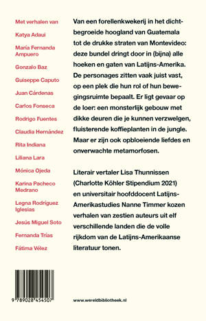 Literair vertaler Lisa Thunnissen (Charlotte Köhler Stipendium 2021) en universitair hoofddocent Latijns-Amerikastudies Nanne Timmer kozen verhalen van auteurs uit elf verschillende landen die de volle rijkdom van de Latijns-Amerikaanse literatuur tonen.
