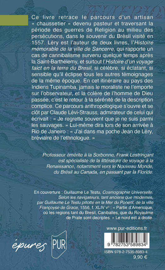 Ce livre retrace le parcours d'un artisan « chaussetier » devenu pasteur et traversant la période des guerres de Religion au milieu des persécutions, dans le souvenir du Brésil visité en 1557. Léry est l'auteur de deux livres, l'Histoire mémorable de la ville de Sancerre, qui rapporte un cas de cannibalisme survenu quelque temps après la Saint-Barthélemy, et surtout l'Histoire d'un voyage faict en la terre du Bresil, si célèbre, si éclatant, si sensible qu'il éclipse tous les autres témoignages de la même époque. En cet itinéraire au pays des Indiens Tupinamba, jamais le moraliste ne l'emporte sur l'observateur, et la colère de l'homme de Dieu passée, c'est le retour à la sérénité de la description complice. Ce parcours anthropologique s'ouvre et se clôt par Claude Lévi-Strauss, admirateur de celui qui écrivait : « Je regrette souvent que je ne suis parmi les sauvages. » Lui-même dira lors de son arrivée à Rio de Janeiro : « J'ai dans ma poche Jean de Léry, bréviaire de l'ethnologue. »