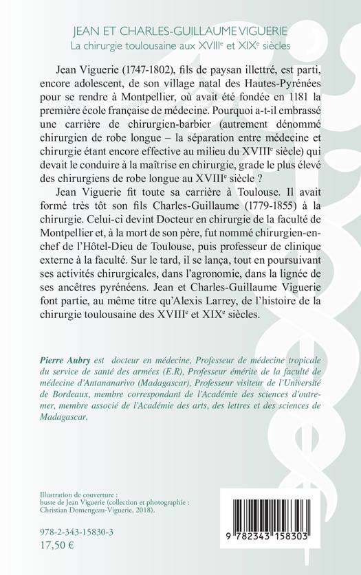 Jean Viguerie (1747-1802), fils de paysan illettré, est parti, encore adolescent, de son village natal des Hautes-Pyrénées pour se rendre à Montpellier, où avait été fondée en 1181 la première école française de médecine. Pourquoi a-t-il embrassé une carrière de chirurgien-barbier qui devait le conduire à la maîtrise en chirurgie, grade le plus élevé des chirurgiens de robe longue au XVIIIe siècle ? Son fils Charles Guillaume devint docteur en chirurgie et fut nommé à la mort de son père chirurgien en chef de l'Hotel-Dieu de Toulouse.