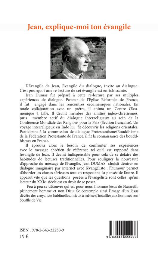 Relire l'Evangile de Jean est enrichissant : c'est une invite au dialogue. Jean Dumas y fut préparé par ses multiples expériences. Pasteur de l'Eglise Réformée de France, il fut engagé dans les rencontres oecuméniques nationales. Il anima un Centre cuménique à Lille et devint membre des amitiés judéo-chrétiennes, puis membre actif du dialogue interreligieux au sein de la Conférence Mondiale des Religions pour la Paix. Un voyage interreligieux en Inde lui fit découvrir les religions orientales. La commission de dialogue Protestantisme/Bouddhisme lui fit faire la connaissance des bouddhismes en France. Il éprouva le besoin de confronter ses expériences avec le message chrétien de référence et de se défaire des habitudes de lectures traditionnelles. Pour souligner la nouveauté d'approche du message de l'évangile, Jean Dumas choisit d'entrer en dialogue imaginaire par internet avec l'évangéliste : avec humour, se découvre un Jésus de Nazareth pleinement homme.