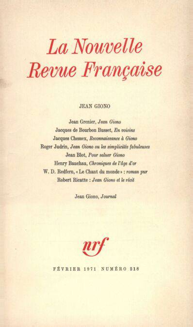 Jean Giono : Jean Grenier, Jean Giono Jacques de Bourbon Busset, En voisins Jacques Chessex, Reconnaissance à Giono Roger Judrin, Jean Giono ou Les simplicités fabuleuses Jean Blot, Pour saluer Giono Henry Bauchau, Chroniques de l'âge d'or Walter D. Redfern, Le Chant du monde : roman pur Robert Ricatte, Jean Giono et le récit Jean Giono, Journal