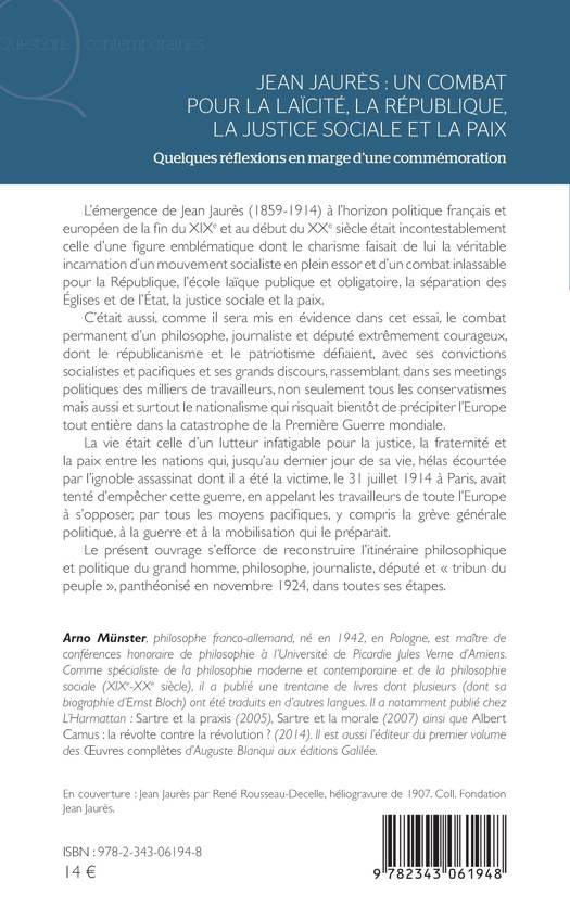 L'émergence de Jean Jaurès (1859-1914) à l'horizon politique français et européen de la fin du XIXe et au début du XXe siècle était incontestablement celle d'une figure emblématique dont le charisme faisait de lui la véritable incarnation d'un mouvement socialiste en plein essor et d'un combat inlassable pour la République, l'école laïque et obligatoire, la séparation des Églises et de l'État, la justice sociale et la paix. Le présent ouvrage reconstruit l'itinéraire philosophique et politique du grand homme, philosophe, journaliste, député et "tribun du peuple", dans toutes ses étapes.