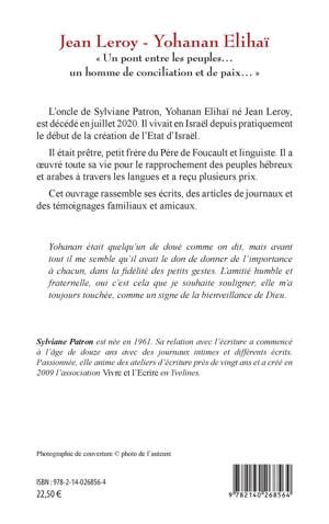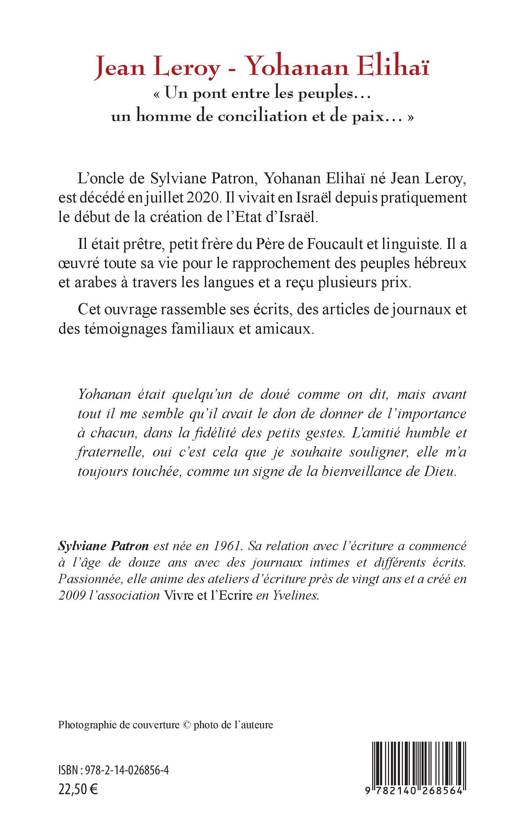 L’oncle de Sylviane Patron, Yohanan Elihaï né Jean Leroy, est décédé en juillet 2020. Il vivait en Israël depuis pratiquement le début de la création de l’Etat d’Israël. Il était prêtre, petit frère du Père de Foucault et linguiste. Il a oeuvré toute sa vie pour le rapprochement des peuples hébreux et arabes à travers les langues et a reçu plusieurs prix. Cet ouvrage rassemble ses écrits, des articles de journaux et des témoignages familiaux et amicaux.