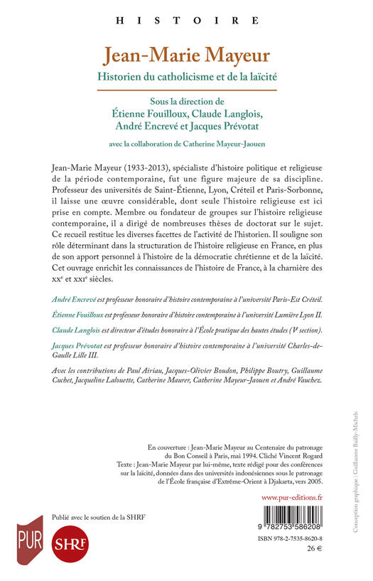 Jean-Marie Mayeur (1933-2013), spécialiste d'histoire politique et religieuse de la période contemporaine, fut une figure majeure de sa discipline. Professeur des universités de Saint-Étienne, Lyon, Créteil et Paris-Sorbonne, il laisse une oeuvre considérable, dont seule l'histoire religieuse est ici prise en compte. Membre ou fondateur de groupes sur l'histoire religieuse contemporaine, il a dirigé de nombreuses thèses de doctorat sur le sujet. Ce recueil restitue les diverses facettes de l'activité de l'historien. Il souligne son rôle déterminant dans la structuration de l'histoire religieuse en France, en plus de son apport personnel à l'histoire de la démocratie chrétienne et de la laïcité. Cet ouvrage enrichit les connaissances de l'histoire de France, à la charnière des XXe et XXI siècles.