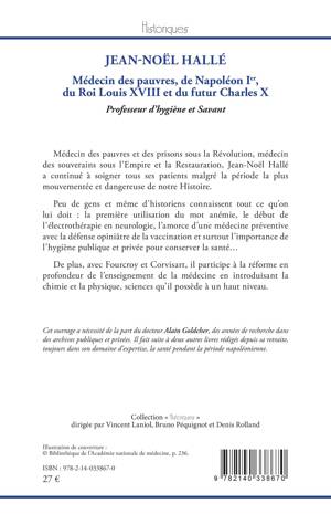 Médecin des pauvres et des prisons sous la Révolution, médecin des souverains sous l'Empire et la Restauration, Jean-Noël Hallé a continué à soigner tous ses patients malgré la période la plus mouvementée et dangereuse de notre Histoire. Peu de gens et même d'historiens connaissent tout ce qu'on lui doit: la première utilisation du mot anémie, le début de l'électrothérapie en neurologie, l'amorce d'une médecine préventive avec la défense opiniâtre de la vaccination et surtout l'importance de l'hygiène publique et privée pour conserver la santé... De plus, avec Fourcroy et Corvisart, il participe à la réforme en profondeur de l'enseignement de la médecine en introduisant la chimie et la physique, sciences qu'il possède à un haut niveau.