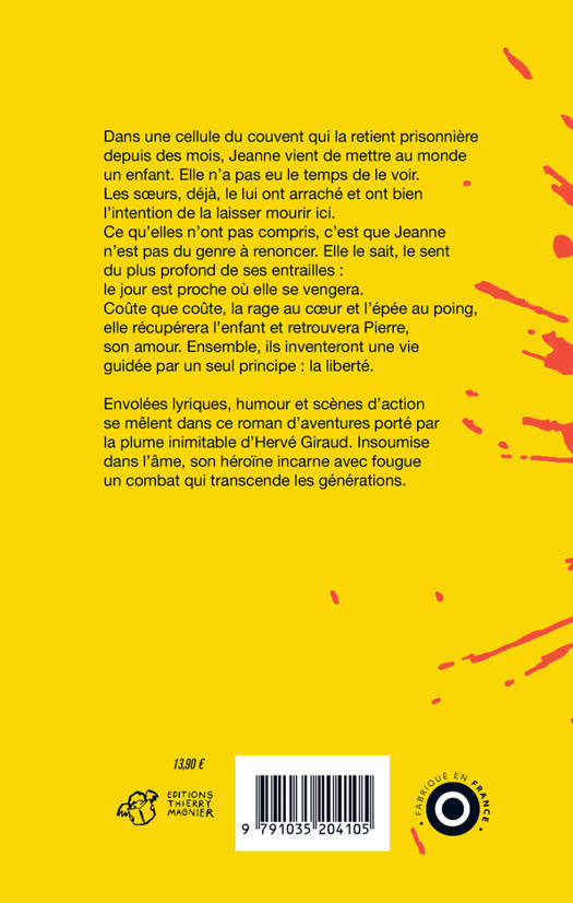 Dans une cellule du couvent qui la retient prisonnière depuis des mois, Jeanne vient de mettre au monde un enfant. Elle n'a pas eu le temps de le voir. Les soeurs, déjà, le lui ont arraché et ont bien l'intention de la laisser mourir ici. Ce qu'elles n'ont pas compris, c'est que Jeanne n'est pas du genre à renoncer. Elle le sait, le sent du plus profond de ses entrailles : le jour est proche où elle se vengera. Coûte que coûte, la rage au coeur et l'épée au poing, elle récupérera l'enfant et retrouvera Pierre, son amour. Ensemble, ils inventeront une vie guidée par un seul principe : la liberté.