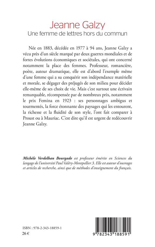Née en 1883 et décédée en 1977, Jeanne Galzy a connu un siècle marqué par deux guerres mondiales et de fortes évolutions concernant notamment la place des femmes dans la société. Professeur, romancière, poète et auteur dramatique, elle est l'exemple même d'une femme qui a su conquérir son indépendance. Mais elle est surtout une écrivain remarquable, récompensée par le prix Femina en 1923.