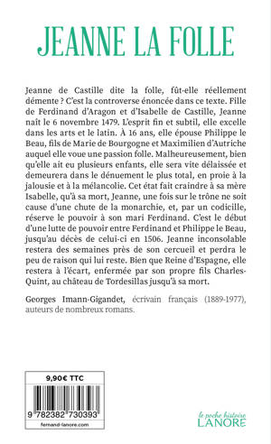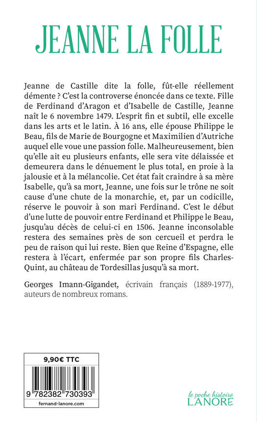 Reine, amoureuse, démente, Jeanne de Castille dite la folle, fût-elle réellement démente ? C’est la controverse énoncée dans ce texte. Fille de Ferdinand d’Aragon et d’Isabelle de Castille, Jeanne naît le 6 novembre 1479. L’esprit fin et subtil, elle excelle dans les arts et le latin. À 16 ans, elle épouse Philippe le Beau, fils de Marie de Bourgogne et Maximilien d’Autriche auquel elle voue une passion folle. Malheureusement, bien qu’elle ait eu plusieurs enfants, elle sera vite délaissée et demeurera dans le dénuement le plus total, en proie à la jalousie et à la mélancolie. Cet état fait craindre à sa mère Isabelle, qu’à sa mort, Jeanne, une fois sur le trône ne soit cause d’une chute de la monarchie, et, par un codicille, réserve le pouvoir à son mari Ferdinand. C’est le début d’une lutte de pouvoir entre Ferdinand et Philippe le Beau, jusqu’au décès de celui-ci en 1506. Jeanne inconsolable restera des semaines près de son cercueil et perdra le peu de raison qui lui reste. Bien que Reine d’Espagne, elle restera à l’écart, enfermée par son propre fils Charles-Quint, au château de Tordesillas jusqu’à sa mort.