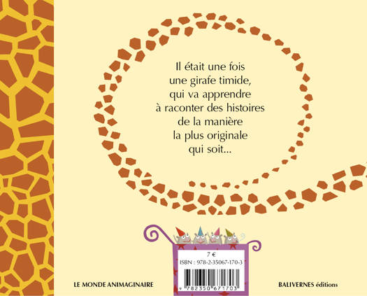 Jeanne est une girafe timide qui n'ose pas prendre la parole en public, qui n'ose pas non plus raconter des blagues comme ses amis, et elle ne chante que sous sa douche. Voulant vaincre sa timidité, elle va voir Baba le babouin, sage parmi les sages, qui aura une idée extraordinaire... La magie de l'imagination prend véritable corps ici, car Jeanne utilisera les taches de son pelage pour dessiner ses histoires, montrant que chacun peut être différent et peut trouver dans ses qualités propres les ressources et les idées pour avancer et progresser à sa manière. Les dessins aux couleurs chaudes et vives plaisent aussi bien aux enfants qu'aux parents et un coloriage en fin de livre permet aux enfants de s'approprier véritablement l'ouvrage.