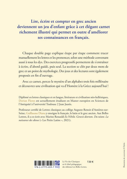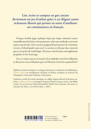 Lire, écrire et compter en grec ancien deviennent un jeu d’enfant grâce à cet élégant carnet richement illustré qui permet en outre d’améliorer ses connaissances en français. Chaque double page explique étape par étape comment tracer manuellement les lettres et les prononcer, selon une méthode convenant aussi à tous les dys. Des exercices progressifs permettent de s’entraîner à écrire, d’abord guidé, puis seul. La section se clôt par deux mots de grec et un point de mythologie. Des jeux et des lectures sont également proposés en fin d’ouvrage.