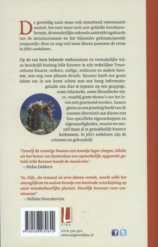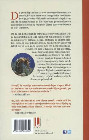 Op de van hem bekende enthousiaste en vermakelijke wijze beschrijft bioloog Jelle Reumer bizarre, eetbare, zielige, zeldzame en andere beesten, met oog voor pikante details. Reumer heeft een groot talent om in een korte schets met een hoog informatiegehalte een dier te typeren op een grappige, soms hilarische, soms filosofische wijze, waarbij grote thema's van het leven niet geschuwd worden. Samen geven ze een prachtig beeld van de enorme diversiteit aan dieren met hun specifieke eigenschappen en eigenaardigheden, waarin we onszelf maar al te gemakkelijk kunnen herkennen. 'Jelle's weekdieren'is een bundeling van speciaal voor dit boek bewerkte columns, eerder verschenen in Trouw. * Jelle Reumer is bioloog en directeur van Het Natuurhistorisch Museum Rotterdam. Hij is tevens hoogleraar paleontologie in Utrecht , columnist in Trouw en auteur van diverse boeken op het gebied van evolutie en (stads)natuur. Samen met Martijn van Calmthout schreef hij 'Nobel op de kaart. Op zoek naar de Nederlandse Nobelprijswinnaars van vroeger en nu'.