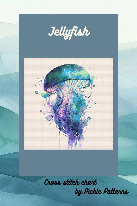This cross stitch chart is a whimsical design of a jellyfish with a watercolour appearance.