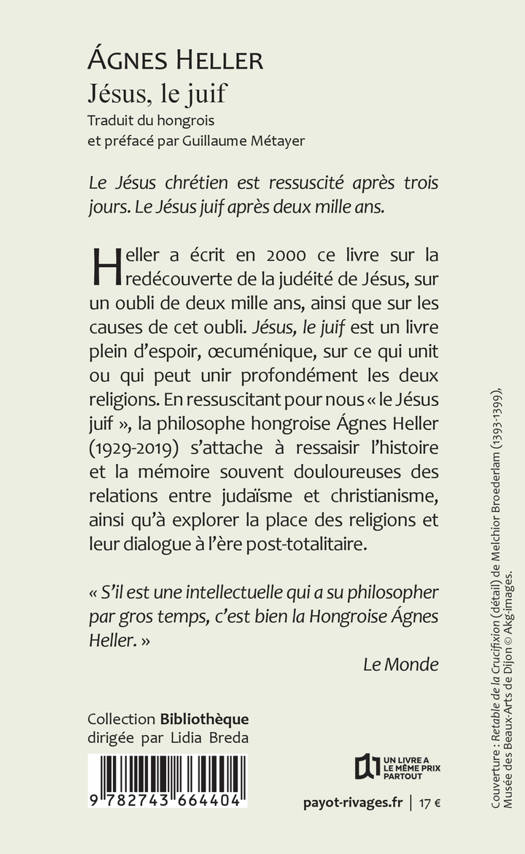 Le Jésus chrétien est ressuscité après trois jours. Le Jésus juif après deux mille ans. Heller a écrit en 2002 ce livre sur la redécouverte de la judéité de Jésus, sur un oubli de deux mille ans, ainsi que sur les causes de cet oubli. Jésus, le juif est un livre plein d'espoir, oecuménique, sur ce qui unit ou qui peut unir profondément les deux religions. En ressuscitant pour nous « le Jésus juif », la philosophe hongroise Ágnes Heller (1929-2019) s'attache à ressaisir l'histoire et la mémoire souvent douloureuses des relations entre judaïsme et christianisme, ainsi qu'à explorer la place des religions et leur dialogue à l'ère post-totalitaire. « S'il est une intellectuelle qui a su philosopher par gros temps, c'est bien la Hongroise Ágnes Heller. » (Le Monde)
