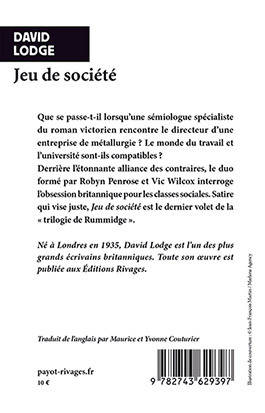Que se passe-t-il lorsqu'une sémiologue rencontre le directeur d'une entreprise de métallurgie? C'est le duo imaginé par David Lodge dans «Jeu de société. »Derrière l'étonnante alliance des contraires, Lodge interroge la société anglaise et son obsession des classes. Subvertissant le modèle du roman social par l'humour, Lodge tisse une comédie intelligente, qui a conquis plus de 180 000 lecteurs en France.
