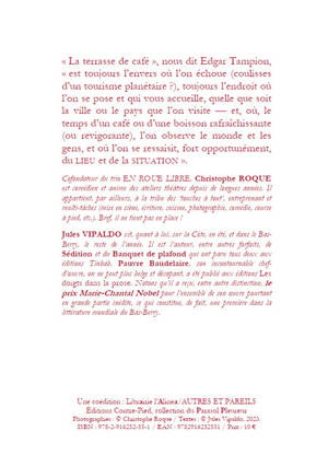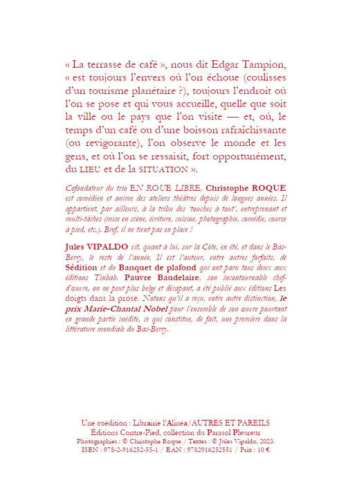 La ‘terrasse de café’ est toujours l’envers où l’on échoue (coulisses d’un tourisme planétaire ?), toujours l’endroit où l’on se pose et qui vous accueille, quelle que soit la ville ou le pays que l’on visite — et, où, le temps d’un café ou d’une boisson rafraîchissante (ou revigorante), l’on observe le monde et les gens, et où l’on se ressaisit, fort opportunément, du LIEU et de la SITUATION.