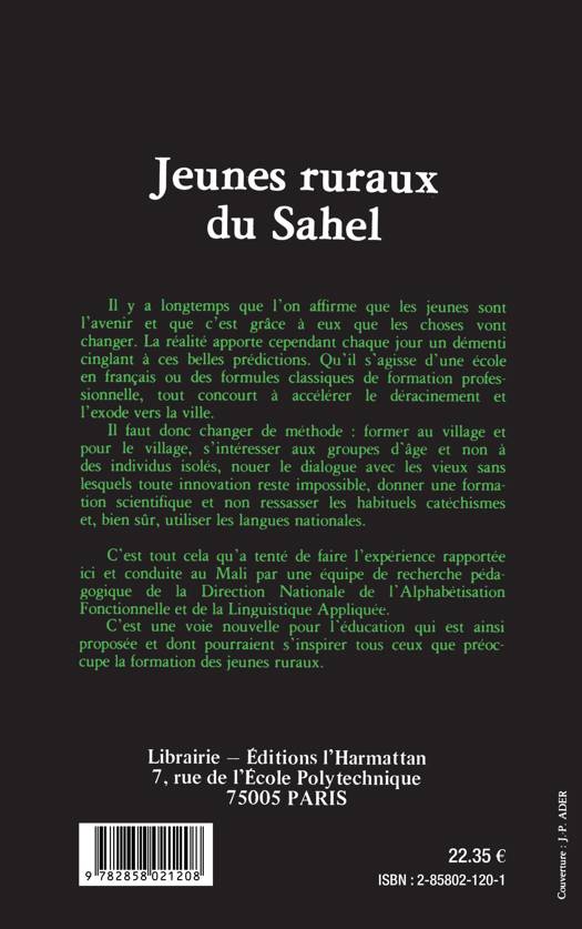 Il y a longtemps que l'on affirme que les jeunes sont l'avenir et que c'est grâce à eux que les choses vont changer. La réalité apporte cependant chaque jour un démenti cinglant à ces belles prédictions. Qu'il s'agisse d'une école en français ou des formules classiques de formation professionnelle, tout concourt à accélérer le déracinement et l'exode vers la ville. Il faut donc changer de méthode : former au village et pour le village, s'intéresser aux groupes d'âge et non à des individus isolés, nouer le dialogue avec les vieux sans lesquels toute innovation reste impossible, donner une formation scientifique et non ressasser les habituels catéchismes et, bien sûr, utiliser les langues nationales. C'est tout cela qu'a tenté de faire l'expérience rapportée ici et conduite au Mali par une équipe de recherche pédagogique de la Direction Nationale de l'Alphabétisation Fonctionnelle et de la Linguistique Appliquée. C'est une voie nouvelle pour l'éducation qui est ainsi proposée et dont pourraient s'inspirer tous ceux que préoccupe la formation des jeunes ruraux.