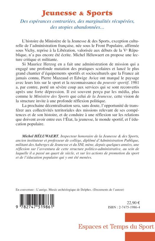 L'Histoire du Ministère de la Jeunesse et des Sports, exception culturelle de l'administration française, née sous le Front Populaire, affirmée sous Vichy, reprise à la Libération, valorisée aux débuts de la Vè république, n'a pas encore été écrite. Michel Héluwaert en propose une lecture critique et militante.