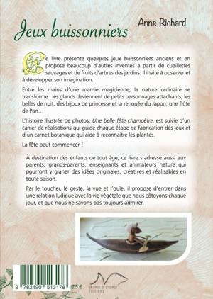 Ce livre présente des jeux buissonniers créés à partir de cueillettes sauvages et de fruits d’arbres des jardins. Entre les mains d’une mamie magicienne, la nature ordinaire se transforme : les glands deviennent de petits personnages attachants, les belles de nuit, des bijoux de princesse et la renouée du Japon, une flûte de Pan... L’histoire, Une belle fête champêtre, suivie d’un cahier de réalisation qui guide chaque étape de fabrication et d’un carnet botanique. Le tout illustré de photos et dessins. La fête peut commencer ! À destination des enfants de tout âge, ce livre s’adresse aussi aux parents, grands-parents, enseignants et animateurs nature qui pourront y glaner des idées originales et réalisables en toute saison. Par le toucher, le geste, la vue et l’ouïe, il propose d’entrer dans une relation ludique et créative avec la vie végétale que nous côtoyons chaque jour. « Ce livre s’adresse aux enfants et à tous ceux qui ont gardé leur âme d’enfant. Qu’il soit une source d’inspiration pour chacun ! Grâce à quelques bouts de bois, des feuilles, des fleurs ou des fruits, et un peu d’habileté, vous pourrez réaliser toutes sortes de merveilles. »
