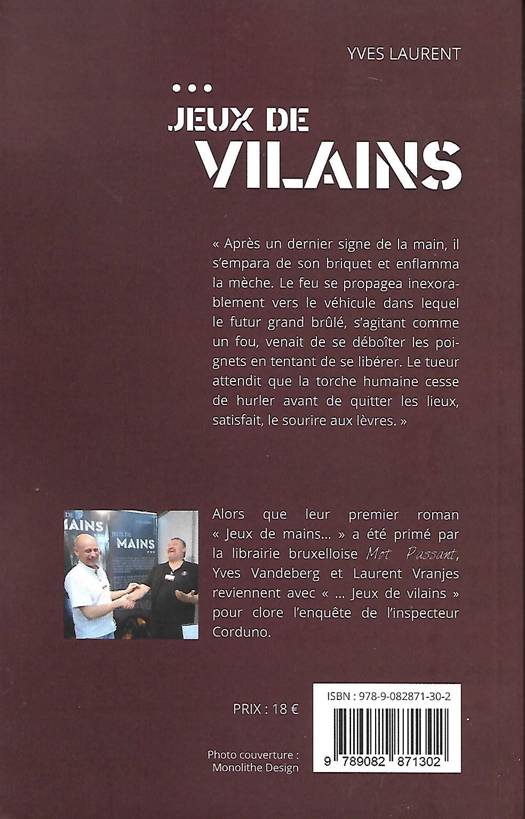 Jeux de Vilains est un thriller policer dont l'action se déroule à Bruxelles. Ce roman est la suite de "Jeux de mains..." publié en avril 2017. Derrière le pseudonyme de Yves Laurent se cachent deux auteurs bruxellois, Yves Vandeberg et Laurent Vranjes.