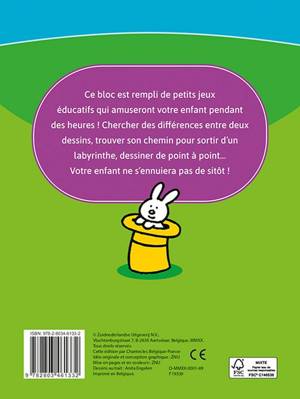Ce bloc est rempli de petits jeux éducatifs qui amuseront votre enfant pendant des heures ! Chercher des différences entre deux dessins, trouver son chemin pour sortir d'un labyrinthe, dessiner de point à point... Votre enfant ne s'ennuiera pas de sitôt ! Pour les enfants de 3 à 4 ans