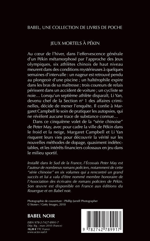 Au coeur de l'hiver, dans l'effervescence générale d'un Pékin métamorphosé par l'approche des Jeux olympiques, six athlètes chinois de haut niveau meurent dans des conditions mystérieuses à quelques semaines d'intervalle : un nageur est retrouvé pendu au plongeoir d'une piscine ; un haltérophile expire dans les bras de sa maîtresse ; trois coureurs de relais périssent dans un accident de voiture ; un cycliste se noie... Lorsqu'un septième athlète disparaît, Li Yan, devenu chef de la Section n° 1 des affaires criminelles, décide de mener l'enquête. Il confi e à Margaret Campbell le soin de pratiquer les autopsies, qui ne révèlent aucune trace de substance connue... Dans ce cinquième volet de la "série chinoise" de Peter May, avec pour cadre la ville de Pékin dans le froid et la neige, Margaret Campbell et Li Yan risquent leurs vies pour découvrir la vérité sur les nouvelles méthodes de dopage, quasiment indétectables, et les intérêts fi nanciers colossaux en jeu dans le milieu sportif.