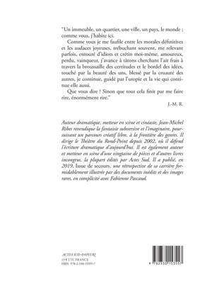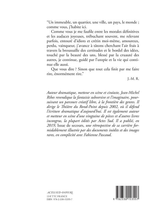 "Un immeuble, un quartier, une ville, un pays, le monde : comme vous, j'habite ici. Comme vous je me faufile entre les morales définitives et les audaces joyeuses, trébuchant souvent, me relevant parfois, entouré d'idiots et crétin moi-même, amoureux, perdu, vainqueur, j'avance à tâtons cherchant l'air frais à travers la broussaille des certitudes et le bordel des idées, touché par la beauté des uns, blessé par la cruauté des autres, je continue, guidé par l'utopie et la vie qui continue elle aussi. Que vous dire ? Sinon que tout cela finit par me faire rire, énormément rire." Jean-Michel Ribes