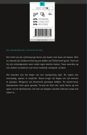 De regels zijn eenvoudig, spelen is verplicht. Quinn krijgt vijf dagen om vijf mensen te kwellen. Weigeren zal drastische gevolgen hebben. De mysterieuze Spelmeester kent geen genade. Terwijl de klok tikt, komt Quinn op het spoor van de Spelmeester, die niet met Jij bent zal stoppen voordat iedereen snapt wat lijden is...