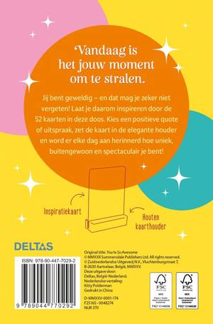 Jij bent geweldig - en dat mag je zeker niet vergeten! Laat je daarom inspireren door de 52 kaarten in deze doos. Kies een positieve quote of uitspraak, zet de kaart in de elegante houder en word er elke dag aan herinnerd hoe uniek, buitengewoon en spectaculair je bent!
