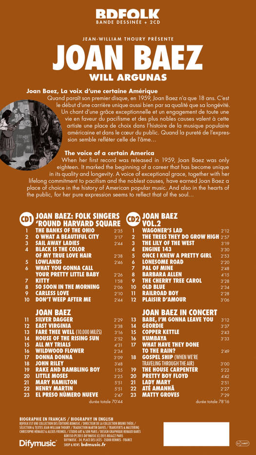 La biographie de Joan Baez, écrite par Jean william Thoury, illustrée par Will argunas, accompagnée de 2 compact discs.<br /><br /> Joan Baez, La voix d’une certaine Amérique<br /> Quand paraît son premier disque, en 1959, Joan Baez n’a que 18 ans. C’est le début d’une carrière unique aussi bien par la qualité que sa longévité. Un chant d’une grâce exceptionnelle et un engagement de toute une vie en faveur du pacifisme et des plus nobles causes valent à cette artiste une place de choix dans l’histoire de la musique populaire américaine et dans le coeur du public. Quand la pureté de l’expression semble refléter celle de l’âme...<br /><br /> The voice of a certain America<br /> When her first record was released in 1959, Joan Baez was only eighteen. It marked the beginning of a career that has become unique in its quality and longevity. A voice of exceptional grace, together with her lifelong commitment to pacifism and the noblest causes, have earned Joan Baez a place of choice in the history of American popular music. And also in the hearts of the public, for her pure expression seems to reflect that of the soul...<br /><br /> CD 1<br /> Joan Baez : Folk Singers 'Round Harvard Square<br /><br /> 01 – The Banks of the Ohio 2’35<br /> 02 – O What a Beautiful City 3’17<br /> 03 - Sail Away Ladies 2’44<br /> 04 – Black Is the Color of My True Love Hair 2’38<br /> 05 – Lowlands 2’46<br /> 06 – What You Gonna Call Your Pretty Little Baby 2’26<br /> 07 – Kitty (with Bill Wood) 1’58<br /> 08 – So Soon in the Morning (with Bill Wood) 2’06<br /> 09 – Carless Love (with Bill Wood) 2’10<br /> 10 – Don’t Weep After Me (with Bill Wood & Ted Alevizos)2’44 <br /><br /> Joan Baez<br /><br /> 11 – Silver Dagger 2’29<br /> 12 – East Virginia 3’38<br /> 13 – Fare Thee Well (10.000 Miles) 3’16<br /> 14 – House of the Rising Sun 2’52<br /> 15 – All My Trials 4’31<br /> 16 – Wildwood Flower 2’34<br /> 17 – Donna Donna 3’09<br /> 18 – John Riley 3’48<br /> 19 – Rake and Rambling Boy 1’55<br /> 20 – Little Moses 3’25<br /> 21 – Mary Hamilton 5’51<br /> 22 – Henry Martin 4’09<br /> 23 – El Preso Nùmero Nueve 2’47<br /><br /> CD 2<br /> Joan Baez Vol.2<br /><br /> 01 – Wagoner’s Lad 2’12<br /> 02 – The Trees They Do Grow High 2’57<br /> 03 – The Lily of the West 3’19<br /> 04 – Engine 143 3’30<br /> 05 – Once I Knew a Pretty Girl 2’53<br /> 06 – Lonesome Road 2’20<br /> 07 – Pal of Mine 2’48<br /> 08 – Barbara Allen 4’15<br /> 09 – The Cherry Tree Carol 3’28<br /> 10 – Old Blue 2’34<br /> 11 – Railroad Boy 2’28<br /> 12 – Plaisir d’amour 3’06<br /><br /> Joan Baez In Concert<br /><br /> 13 – Babe, I’m Gonna Leave You 3’12<br /> 14 – Geordie 3’37<br /> 15 – Copper Kettle 2’43<br /> 16 – Kumbaya 3’33<br /> 17 – What Have The Done to the Rain ? 2’49<br /> 18 – Gospel Ship (When We’re Traveling Through the Air)3’00<br /> 19 – The House Carpenter 5’22<br /> 20 – Pretty Boy Floyd 4’42<br /> 21 – Lady Mary 2’51<br /> 22 – Até Amanhã 2’27<br /> 23 – Matty Groves 7’29<br /><br /> BDR150<br /> CODE BARRE 9782849071502<br /><br /> ISBN<br /> 2-84907-150-1<br /><br /> SELECTION ET TEXTE JEAN WILLIAM THOURY<br /> TRANSLATION MARTIN DAVIES<br /> TRANSFERS AND MASTERING CHRISTOPHE HESNAULT & ALEXIS FRENKEL / STUDIO ART ET SON / DESIGN GRAPHIQUE RENAUD BARES<br /><br /> (p) & © 2015 BDJAZZ PARIS / www.bdmusic.fr<br /><br /> Dépôt Légal novembre 2015<br /><br /><br /> Will Argunas, Arnaud Guillois de son vrai nom, est illustrateur, et auteur de bandes dessinées. Il est né en 1972, à Lille. Après 3 ans d’arts appliqués et un passage chez les petits éditeurs, le label KTSR lui permet d’éclore en 2007 comme auteur de polar borderline. Après 3 albums, il se voit confier l’adaptation de « L’Homme Squelette », un roman de Tony Hillerman pour la prestigieuse collection Rivages/Casterman. La même année il réalise en parallèle cette adaptation de la vie de Memphis Slim. Après avoir été roughman de catalogue, et coloriste de stotyboards de films publicitaires pendant 10 ans, il se consacre désormais à l’illustration, la BD et la peinture.<br /><br />