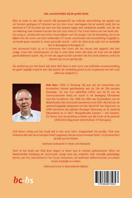 Job, verzetsstrijder bij de gratie GodsWat te doen in een tijd waarin elk perspectief op radicale verandering ten goede ons uit handen geslagen is? Moeten we ons dan maar neerleggen bij de wereld zoals die nu eenmaal is? Of houden we vast aan het protest tegen een verkeerde wereld, ook als we er rekening mee moeten houden dat dat voor niets is? Dat is het thema van het boek Job. De vraag is: zal Job ook voor niets trouw blijven aan het project van de bevrijding, dat in de bijbel met de naam van God verbonden is? Eraan vasthouden dat verandering mogelijk is, armoede geen noodlot is, maar gemaakt wordt – zelfs als niets erop wijst dat er werkelijk iets in beweging te brengen is? Het antwoord luidt: ja, er is tenminste één mens die het verzet niet opgeeft, die niet zwijgt, maar het uitschreeuwt, en het is juist deze mens die door de God van de bijbel gerehabiliteerd wordt. Hij, en niet de zogenaamde vrienden die het laten afweten zodra de kansen op succes gering zijn.De verklaring van het boek Job door Dick Boer is een vorm van politieke rouwverwerking en geeft tegelijk moed in een tijd waarin de verleiding groot is om te geloven dat het toch allemaal vergeefs is.Oorspronkelijke titel: Wenn nichts mehr stimmt … Hiob rettet den NAMEN (2019), vertaald door Greetje Witte-Rang