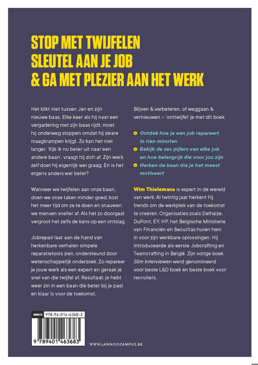 Ontdek hoe je een job repareert in tien minuten Bekijk de zes pijlers van elke job en hoe belangrijk die voor jou zijn Herken de baan die je het meest Motiveert Het klikt niet tussen Jan en zijn nieuwe baas. Elke keer als hij naar een vergadering met zijn baas rijdt, moet hij onderweg stoppen omdat hij zware maagkrampen krijgt. Zo kan het niet langer. 'Kijk ik nu beter uit naar een andere baan?', vraagt hij zich af. Zijn werk zelf doet hij eigenlijk wel graag. En is het ergens anders wel beter? Wanneer we twijfelen aan onze baan, doen we onze taken minder goed, kost het meer tijd om ze te doen en snauwen we mensen sneller af. Als het zo doorgaat vergroot het zelfs de kans op een ontslag. Jobrepair laat aan de hand van herkenbare verhalen simpele reparatietools zien, ondersteund door wetenschappelijk onderzoek. Zo repareer je jouw werk als een expert en geraak je snel van die twijfel af. Resultaat: je hebt weer zin in een baan die beter bij je past en klaar is voor de toekomst. Blijven & verbeteren, of weggaan & vernieuwen - 'onttwijfel' je met dit boek.