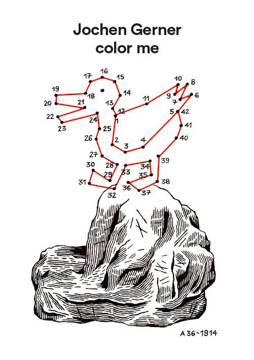 Dessinateur-auteur, Jochen Gerner a plus d'une corde à son arc et sa prolixe verve iconographique est très sollicitée. Pour Color Me, Jochen ne s'est pas contenté de proposer aux enfants des coloriages : il a ajouté un autre jeu, celui des points à relier. Autour de rochers, fourmillent des nuées de points, qui une fois rejoints dessineront des animaux sur socles.