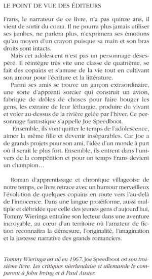 Frans, le narrateur de ce livre, n'a pas quinze ans, il vient de sortir du coma. Il ne pourra plus jamais utiliser ses jambes, ne parlera plus, n'exprimera ses émotions qu'au moyen d'un crayon puisque sa main et son bras droits sont intacts. Mais cet adolescent n'est pas un personnage désespéré. Il réintègre très vite une classe de quatrième, se fait des copains et s'amuse de la vie tout en cultivant son amour pour l'écriture et la littérature. Parmi ses amis se trouve un garçon extraordinaire, une sorte d'apprenti sorcier qui construit un avion, fabrique de drôles de choses pour faire bouger les gens, les extraire de leur léthargie, produire du vivant et voler au-dessus de la rivière gelée par l'hiver. Ce personnage fantastique s'appelle Joe Speedboot. Ensemble, ils vont quitter le temps de l'adolescence, aimer la même fille et devenir inséparables. Car Joe a de grands projets pour son ami, l'idée d'un monde à part où il serait le plus fort. Ensemble, ils entrent dans l'univers de la compétition et pour un temps Frans devient un champion... Roman d'apprentissage et chronique villageoise de notre temps, ce livre retrace avec un humour merveilleux l'évolution de quelques copains en route vers l'au-delà de l'innocence. Dans une langue protéiforme, aussi multiple et débridée que celle des jeunes gens d'aujourd'hui, Tommy Wieringa entraîne son lecteur dans une aventure incroyable, au coeur d'un territoire où l'amateur de fiction reconnaîtra la démesure, l'originalité, l'imagination et la justesse narrative des grands romanciers. Tommy Wieringa est né en 1967. Joe Speedboot est son troisième livre. Les critiques néerlandaise et allemande le comparent à John Irving et à Paul Auster.