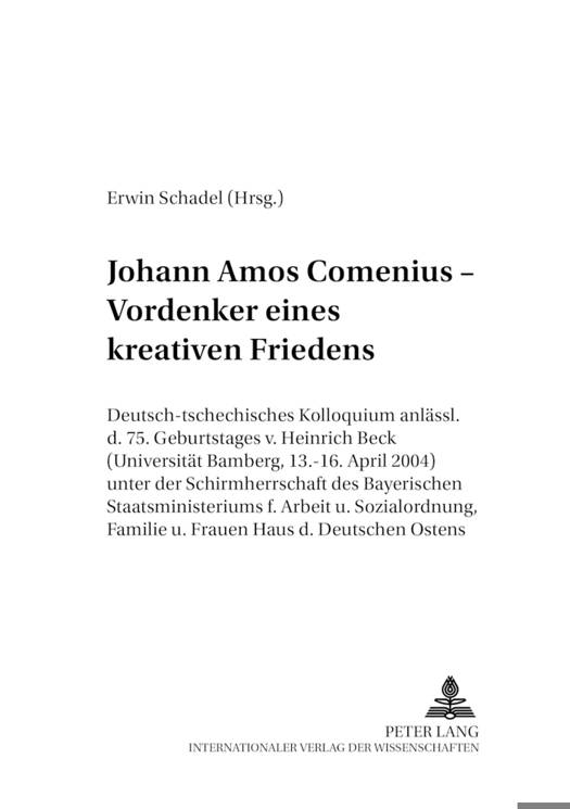 Dieser Band dokumentiert ein deutsch-tschechisches Kolloquium, welches im April 2004 an der Universität Bamberg durchgeführt wurde. Im interdisziplinären Diskurs arbeiten 24 Referentinnen und Referenten (12 aus Tschechien und 12 aus Deutschland) heraus, dass dem ganzheitlichen Denken des Johann Amos Comenius (1592-1670) höchste Aktualität für die derzeitige Globalisierungs-Thematik zuzusprechen ist: Die von Comenius konzipierte Allreform, die politische, philosophische und religiöse Komponenten einschließt, enthält wirksame Potentiale für einen «kreativen Frieden» der Völker und Kulturen. Mit diesem Begriff ist eine Ordnung gemeint, welche nicht von «außen» oder «oben» aufgeprägt wird, sondern sich vielmehr von «innen» her begründet, indem sie der Grunddisposition des menschlichen Seins entspricht. Das genannte Kolloquium versteht sich als weitere Konkretion des international weit verzweigten Forschungsprojektes Kreativer Friede durch Begegnung der Weltkulturen. Initiator dieses Projektes und Nestor des interkulturellen Philosophierens ist der Philosoph Prof. Dr. Dr. h.c. Heinrich Beck, welcher anlässlich seines 75. Geburtstages durch das Bamberger Kolloquium geehrt wurde.