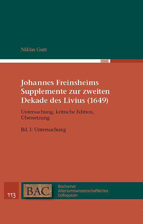 In seinen 1649 veröffentlichten Supplementa Liviana stellt sich Johannes Freinsheim (1608-1660) der Herausforderung, die Überlieferungslücke zwischen den Büchern 10 und 21 des Geschichtswerks des Livius mit zehn eigenen Büchern zu füllen. Dabei imitiert er den antiken Autor in Struktur, Stil und Erzählweise und vermeidet offene Anachronismen ebenso wie Verweise auf seine eigene Person. Die zweite Dekade bildete den Ausgangspunkt für Freinsheims spätere Bemühungen, auch den Rest von Ab urbe condita nach Buch 45 zu ergänzen und das Werk auf diese Weise zu vervollständigen. Obwohl die Supplemente bis ins 19. Jh. hinein große Popularität genossen, fehlte bislang eine gründliche wissenschaftliche Studie. Dieses Desiderat soll mit der vorliegenden Arbeit behoben werden. In Band I wird eine eingehende Untersuchung der Supplemente zur zweiten Dekade geboten: Auf eine Darstellung ihrer Entstehungsvoraussetzungen folgt eine Analyse von Freinsheims Methode bei der Rekonstruktion von Geschichte; im Anschluss werden sprachlich-stilistische sowie narrative Aspekte seiner Livius-Imitation herausgearbeitet, bevor der Text vor seinem geistes- und zeitgeschichtlichen Hintergrund untersucht und schließlich mit Freinsheims Supplementen zu Curtius Rufus verglichen wird. In Band II folgt auf eine Einführung in die Editionsgeschichte der Supplementa Liviana eine kritische Ausgabe des Texts der zweiten Dekade samt Übersetzung. Den lateinischen Text begleitet neben dem kritischen Apparat auch ein Quellenapparat, Sachfragen werden in Anmerkungen zur Übersetzung besprochen.